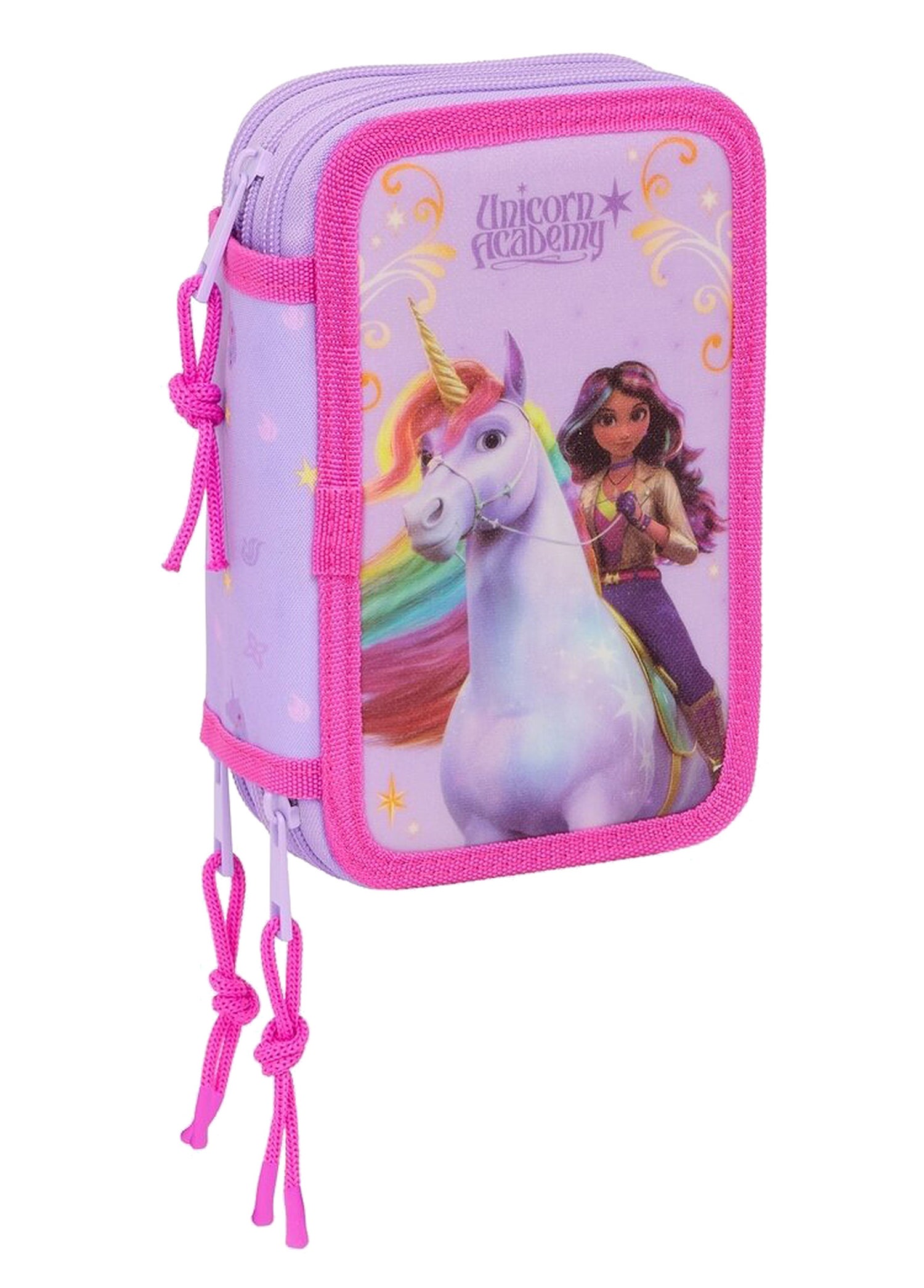 Penalhus med 3 rum fra Unicorn Academy med et komplet skrivesæt. Perfekt til kreative aktiviteter. - Indeholder: 1 penalhus, 1 viskelæder, 1 blyant, 2 kuglepenne, 1 blyantspidser, 2 linealer, 16 farveblyanter, 14 tusser. - Tre rum. - Enhjørningemotiver. - 300D polyester.