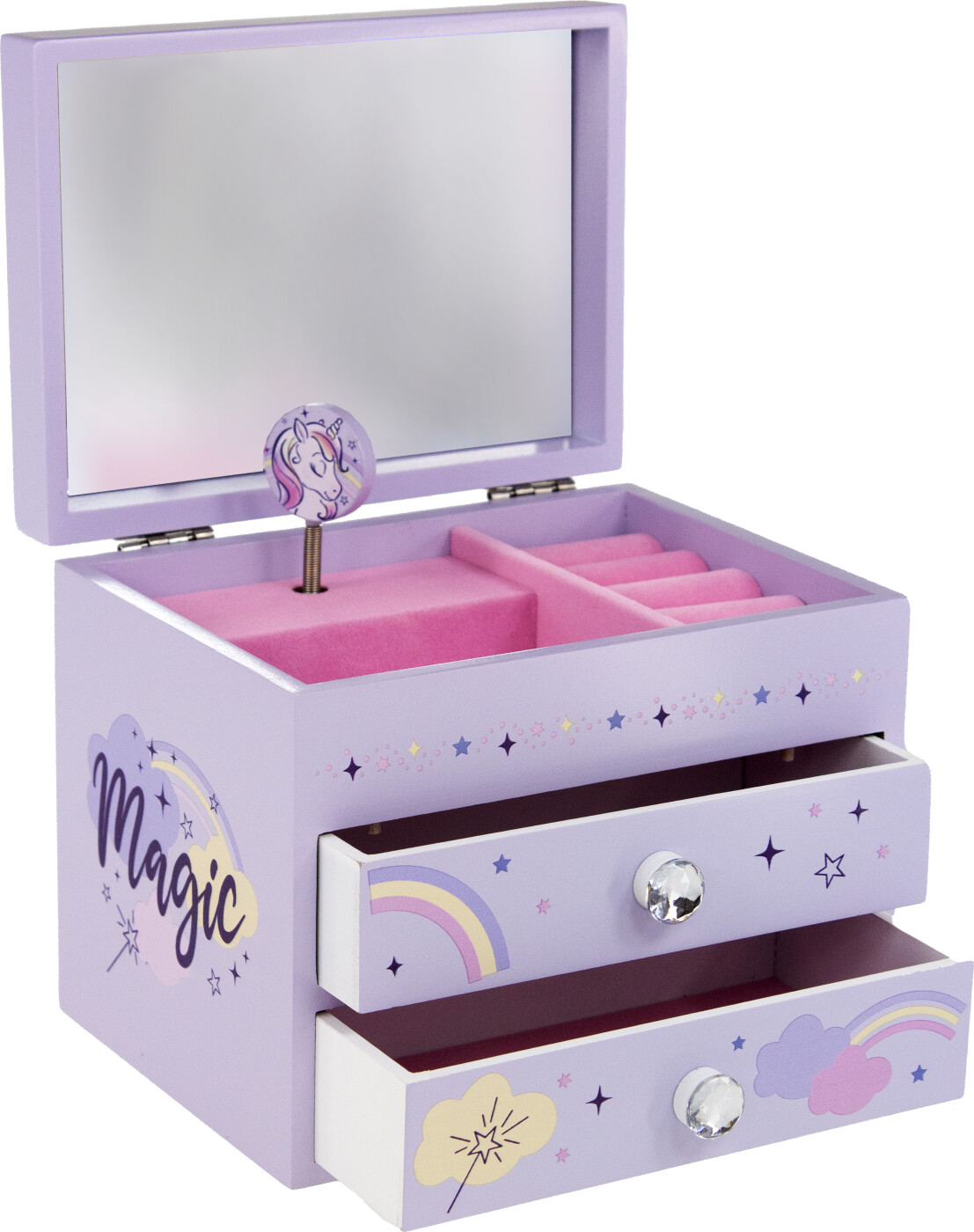 Giv dit barn et magisk sted at opbevare sine smykker med Enhjørning Smykkeskrin Med Musik - Tinka - Lilla. Dette smukke smykkeskrin er designet med en farverig enhjørning, der vil fange børns opmærksomhed og bringe glæde til deres værelse.