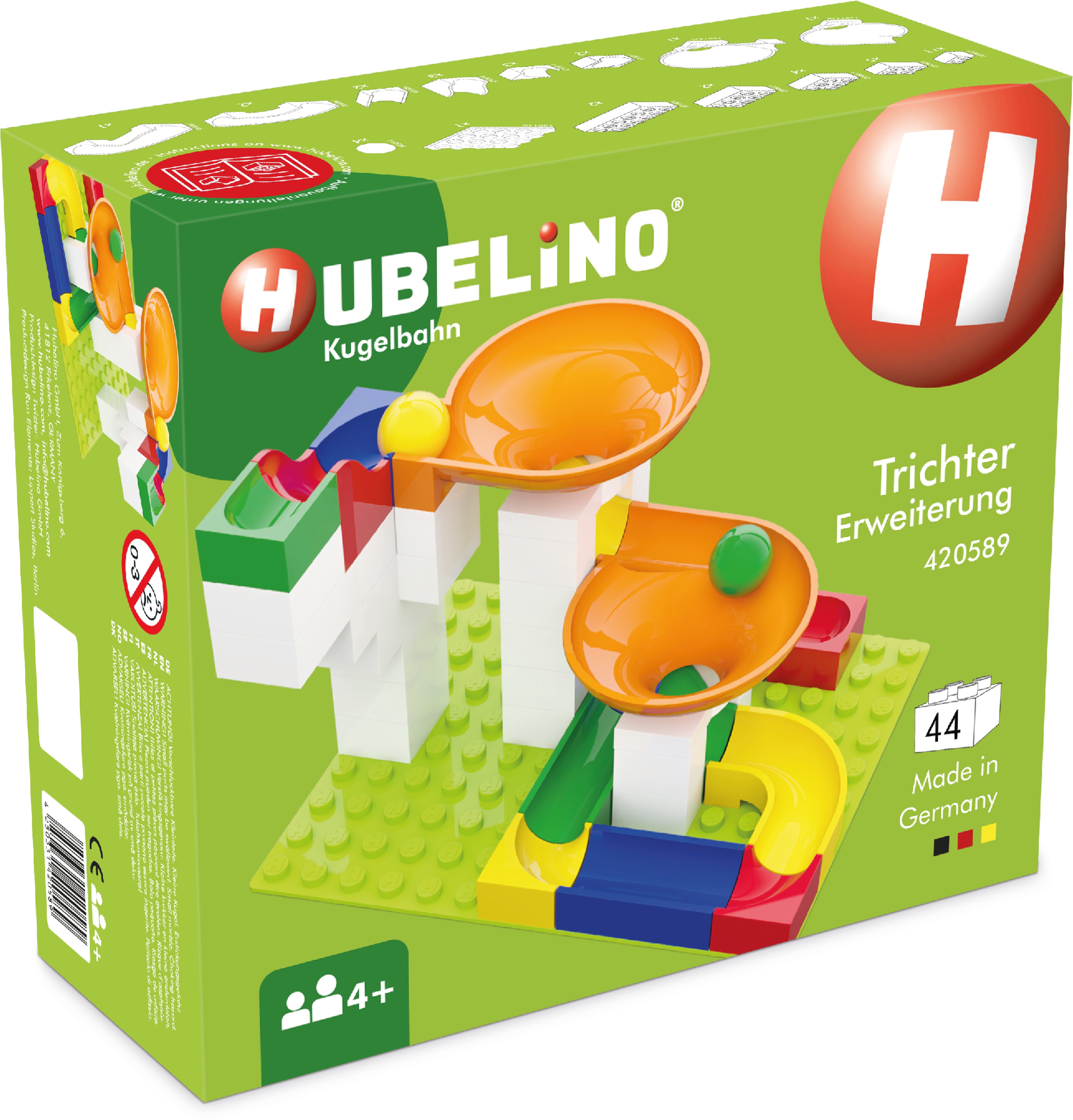 Byg vilde kuglebaner med denne twister fra Hubelino. Hubelino kombinerer kuglebanedele med klassiske byggeklodser. Sættet indeholder to tragte, hvor kuglen snurrer hurtigere og hurtigere jo længere ned, den kommer. Du kan have flere kugler i tragten samtidig. Tragten kan også roteres. Kombiner gerne med andre kuglebanesæt fra Hubelino for at bygge en stor bane. Anbefalet alder: Fra 4 år