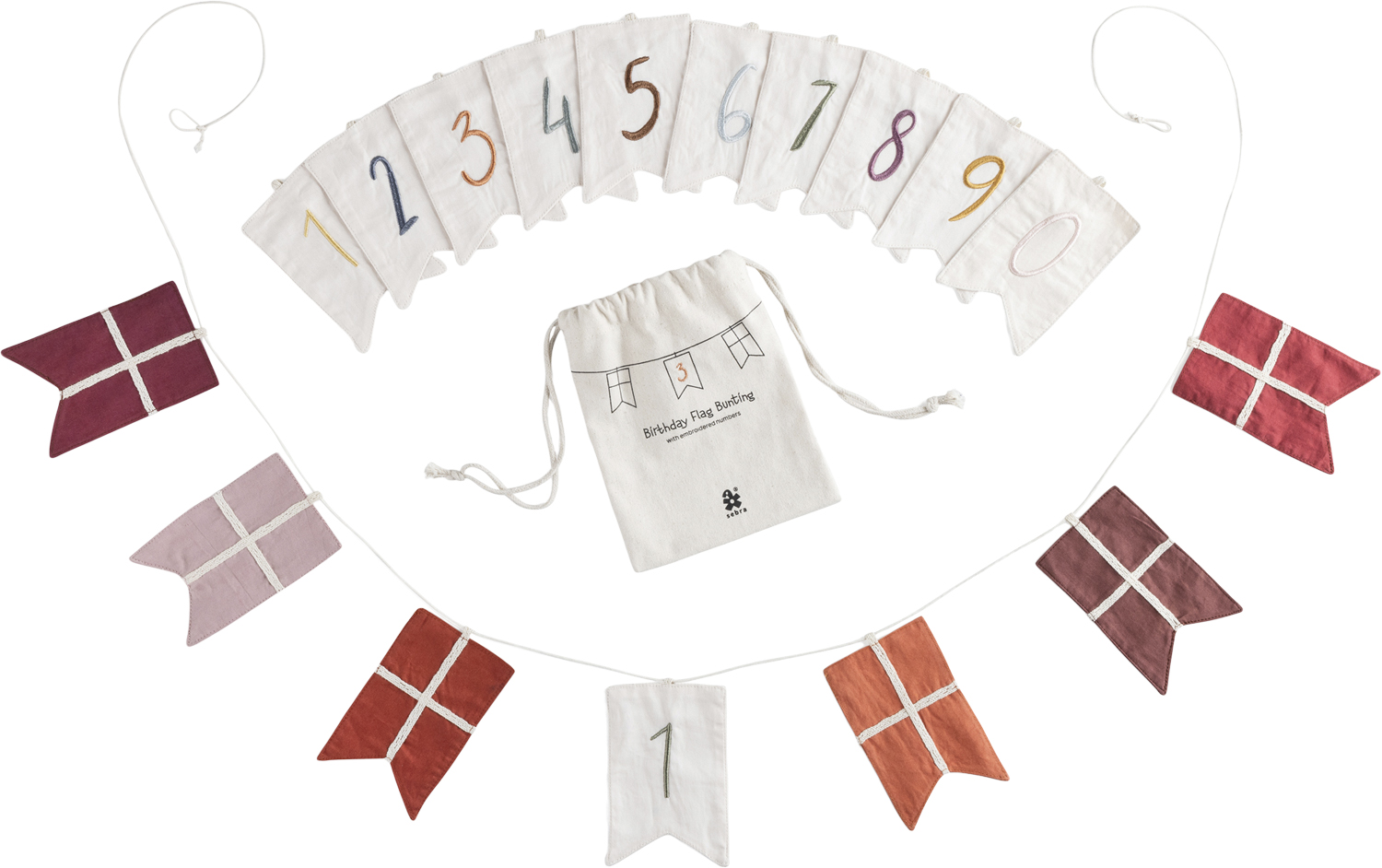 Fødselsdage er noget særligt, og den søde flagranke er perfekt til at fejre alle fødselarer i familien. Flagranken består af 6 Dannebrogsflag fremstillet af økologisk bomuld i afstemte røde nuancer samt 11 flag med tallene fra 0 til 9 broderet på. Der er