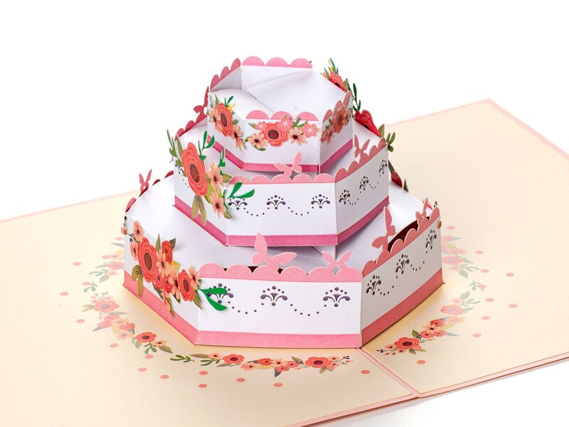 Fejr brudeparret og deres blomstrende kærlighed med et romantisk pop up-kort, hvor et 3D-motiv i form af en smukt dekoreret bryllupskage dukker op, når kortet åbnes. Leveres med kuvert.