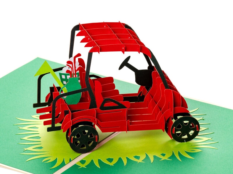 Sig tillykke til golfspilleren med et sjovt pop up-kort, måske for at fejre sidste rundes birdie! Når 3D-kortet åbnes, dukker motivet op i form af en golfvogn! Leveres med kuvert.