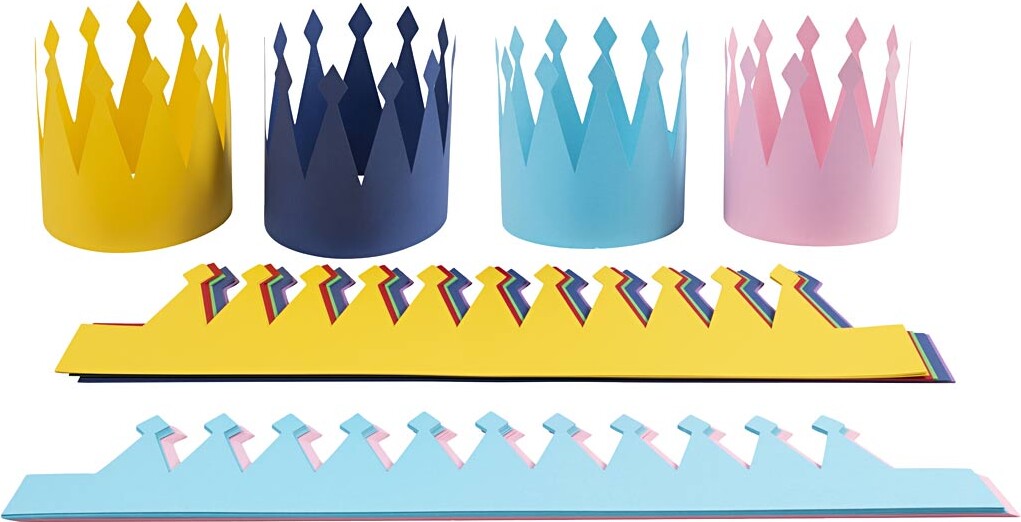 Fødselsdagskroner i festlige farver, som børnene selv kan dekorere. Pynt fx med glimmer, pailetter...