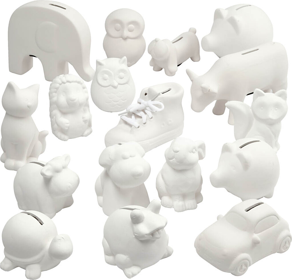 Det er aldrig for tidligt eller for sent at lære at spare op. Her får du hele 106 søde og kreative sparebøsser i hvidt, ubehandlet terrakotta. Sparebøsserne er formede som forskellige objekter og...