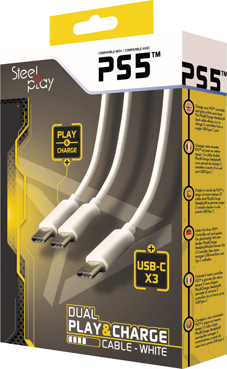 Oplad dine PS5TM-controllere, mens du spiller.  Dette førsteklasses kabel giver dig mulighed for at oplade to controllere samtidigt, mens du spiller, så du aldrig går glip af et beat i kampens...