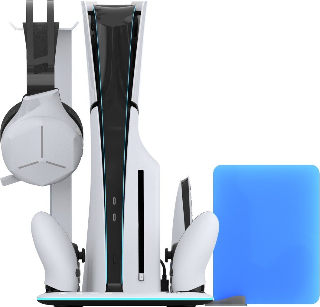Det stilfulde design passer perfekt til PS5 Slim-konsollen. Diskret platform med drop and charge...