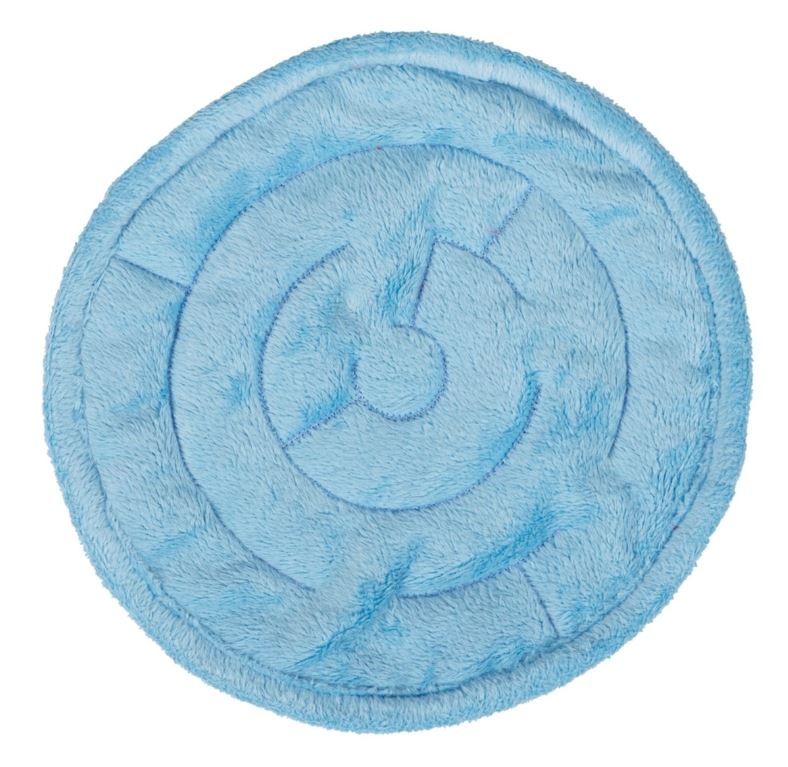 Der er syet en kugle af træ ind i denne runde pude, som dit barn skal bruge fingrene til at få ført rundt i labyrinten.