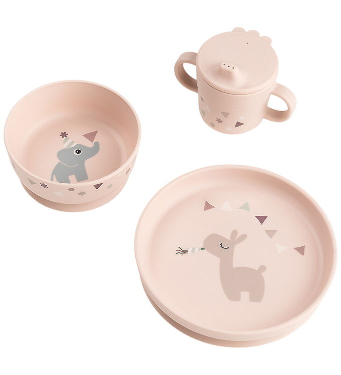 Spisesættet inkluderer en tallerken, skål og en kop, alle udstyret med en praktisk sugekop, der sikrer, at de forbliver på plads under måltidet. Den bløde pudderfarve tilføjer et elegant touch til borddækningen, og de søde dyremotiver gør det til et hit blandt børn.