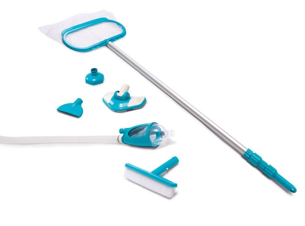 Stort vedligeholdelsessæt fra Intex med 279 cm aluminiums teleskop stang, kost, opsamler net og støvsuger, samt slange på 7,5 meter. Kræver en filterpumpe med minimum 3.028 liter i time pumpe flow. Indeholder 13 dele, se manualen side 4 for mere informa