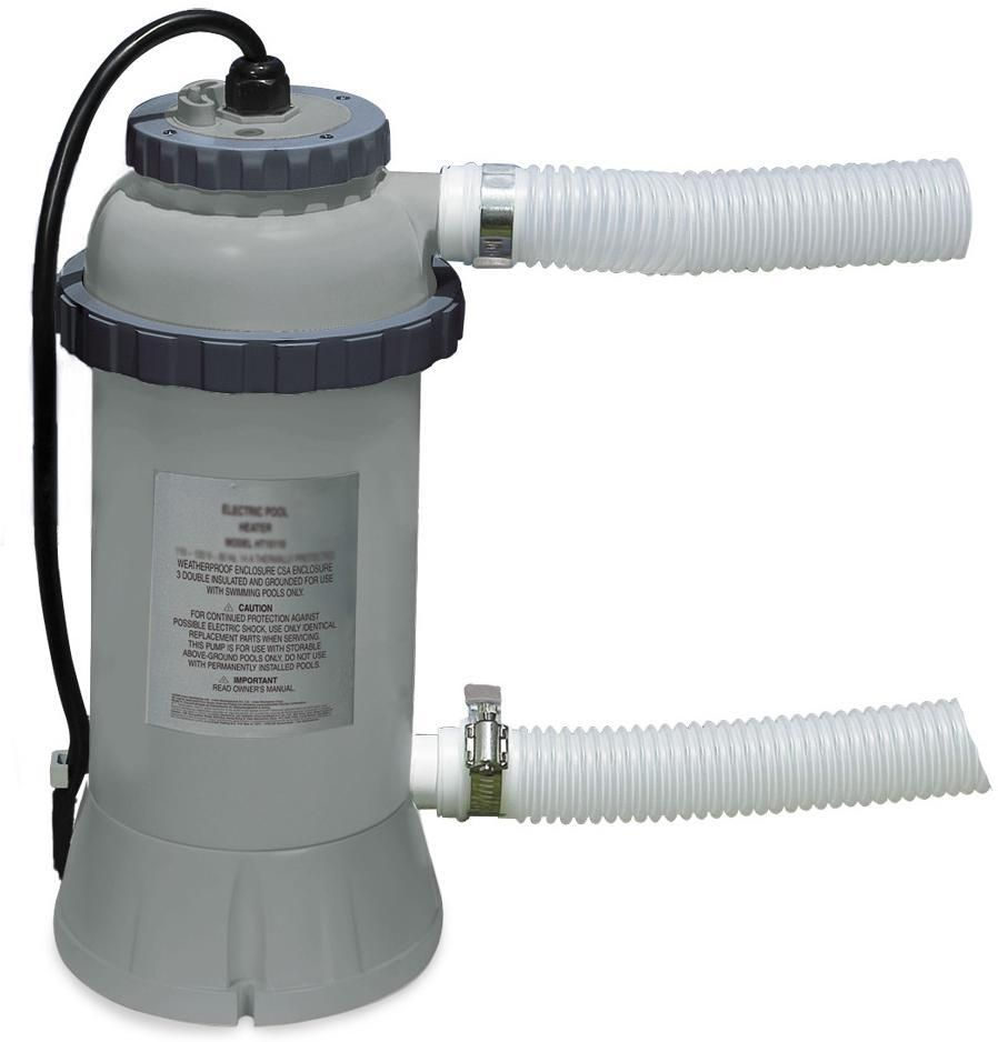 Intex Elektrisk pool opvarmer -  Anbefales til pools med en diameter på 457cm eller herunder. Bruger 32mm tilslutninger, men kan bruges sammen med pumper med 38mm tilslutninger med hjælp fra adapter. Kræver et pumpeflow på minimum 1.893 L/t og maximum 9.4