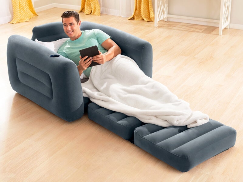Siddeplads og ekstraseng i ét! Den oppustelige lænestol fra Intex kan foldes ud til ekstramadras på nul komma fem, perfekt som både en dejlig ekstra siddeplads i for eksempel sommerhuset eller opholdsstuen, og som gæsteseng, når nogen skal overnatte.