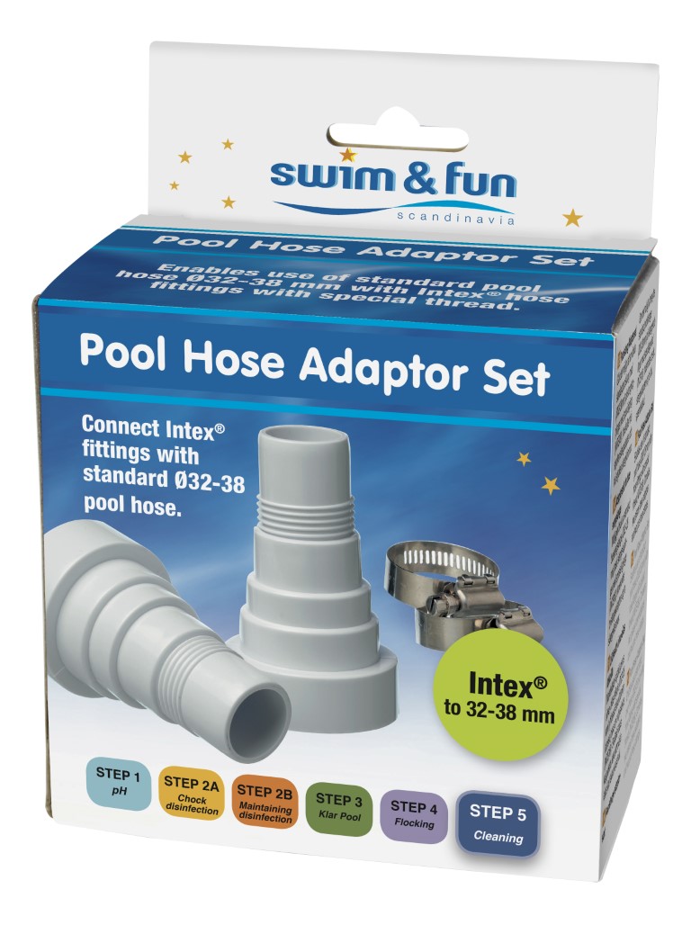 Slangeadapter til kobling af standard poolslange på INTEX specialgevind Dette adaptersæt gør det muligt at benytte standard poolslange Ø32-38 på slangekoblinger med specialgevind, som fx. INTEX. Indeholder to stk. slangeadaptere, to o-ringe samt to stk sp