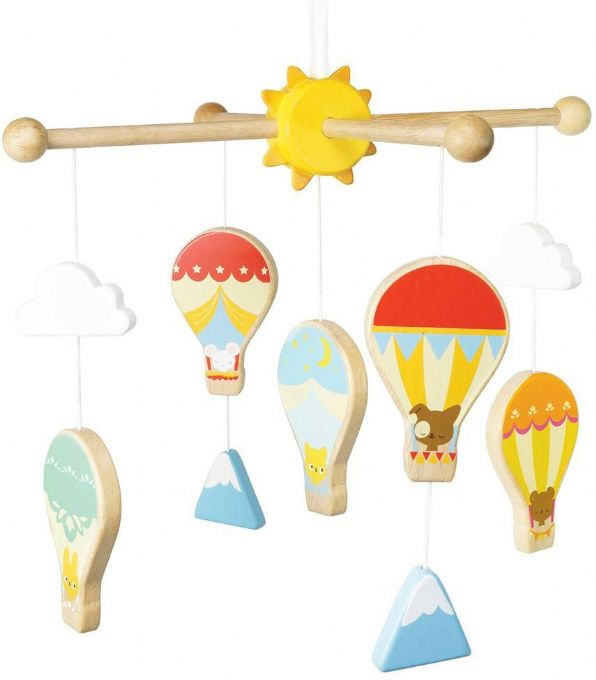 Et farverigt uro med tręmotiver af luftsballoner, skyer og bjerge. Uroet er beregnet til at hęnge ned fra loftet.