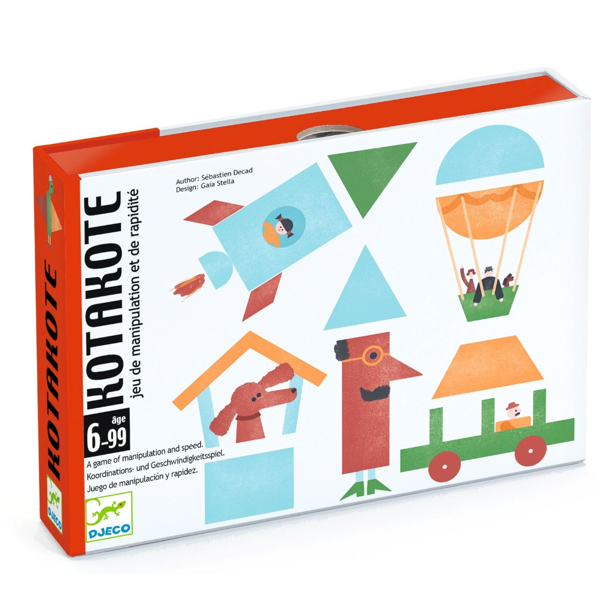 Her gælder det om at holde øje og også være hurtig. Hver spille får 4 kort hver og så har I en fælles kortbunke med opgaver. Vælg mellem to sværhedsgrader, så spillet kan vokse med dit barn.Nu trækker I en fælles opgave fra bunken og så gælder det om at kombinere sine kort og skabe den samme figur som ses på opgavekortet. Den der får først sammensat figuren rigtigt og vinder kortet råber Kotakote.Hvis man kommer til at sammensætte sin figur forkert mister man et kort, hvis man har vundet et.I kan fx spille med at man vinder, når man har vundet 5 opgavekort.