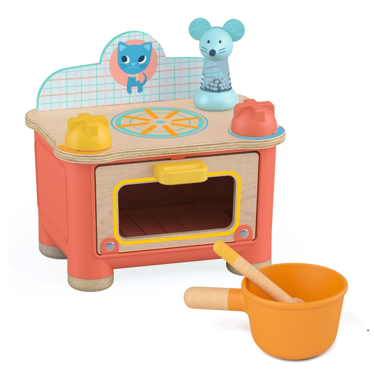 Kogekunst i juniorformat. Er dit barn tit med i køkkenet, måske bare siddende i en høj stol ved siden af, så er nysgerrigheden vakt. Stil dette lille, meget søde komfur ude i jeres køkken, så kan I lave mad sammen. Det lille komfur har drejeknapper, der er nemme at skrue på, en fin kasserolle, en salt/sukkerbøsse med herlige raslelyde, grydeske og en ovn med ovndør, der er nem at åbne og lukke. Navnlig salt/sukkerraslebøssen spår vi bliver et hit, så både dit barns, de voksnes og kattens mad kan få et ordentligt pulver. Raslelyde er nemlig altid sjove, og det er en god leg at vise dit barn, at man først spørger, om der skal mere salt/sukker på, og derefter drysse på, og så skal man sige tak bagefter, hvorefter bøssebestyreren kan sige velbekomme.
