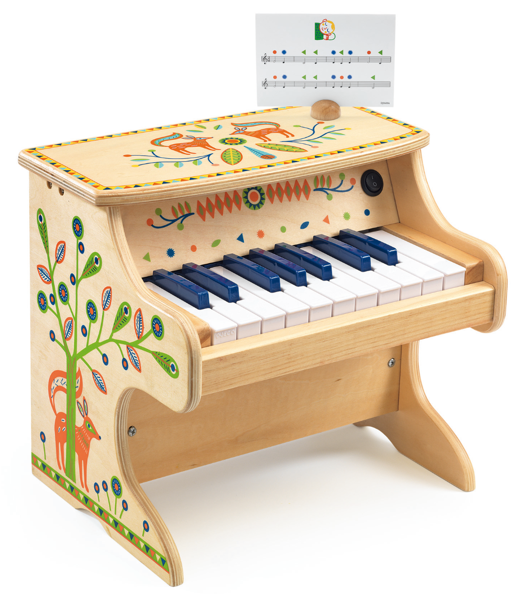 Små drenge og piger kan få så meget ględe og lęring ud af at spille på dette fine, lille begynderklaver med rigtig fin lyd i de 18 tangenter.Der medfųlger 4 kort med farvekodede, lette melodier, så dit barn kan lęre at spille dem ved hjęlp af farverne over tangenterne.Nęrmest et musthave for spektakelmagere. Lyden er elektronisk, så klaveret bruger 4 stk AA batterier, som ikke medfųlger.