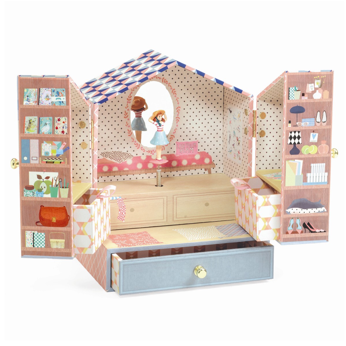Yndigt skrin med mange rum og skuffer, der kan gemme på dejlige skatte. Ballerinaen danser rundt ved sin seng, mens tonerne fra Mozarts Tryllefløjten spiller.Styrker dit barns musikalitet og nysgerrighed og er helt lavpraktisk rart at have til diverse småting, der hurtigt bliver væk eller slugt af støvsugeren.En super fin gave. Fremstillet af hårdt pap.