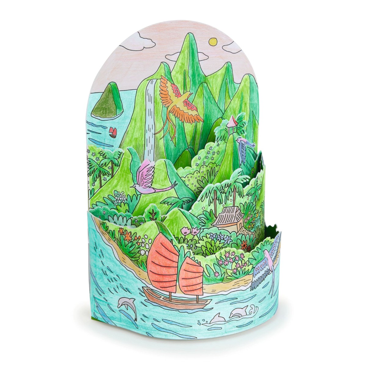 Først skal tegningerne farvelægges. Derefter kan de foldes og sættes sammen ved hjælp af smarte indhak og uden brug af lim eller tape.Med tre lag papir, der giver øen dybdeSjov lille gaveide.