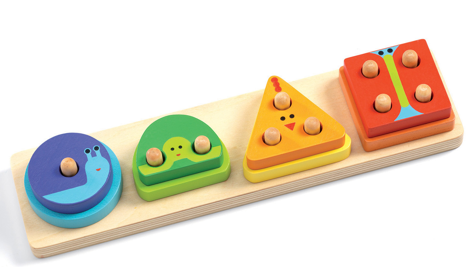 Fint sorteringsbræt i to lag af træ, som lærer dit barn om former, farver og de helt små tal fra 1-4.