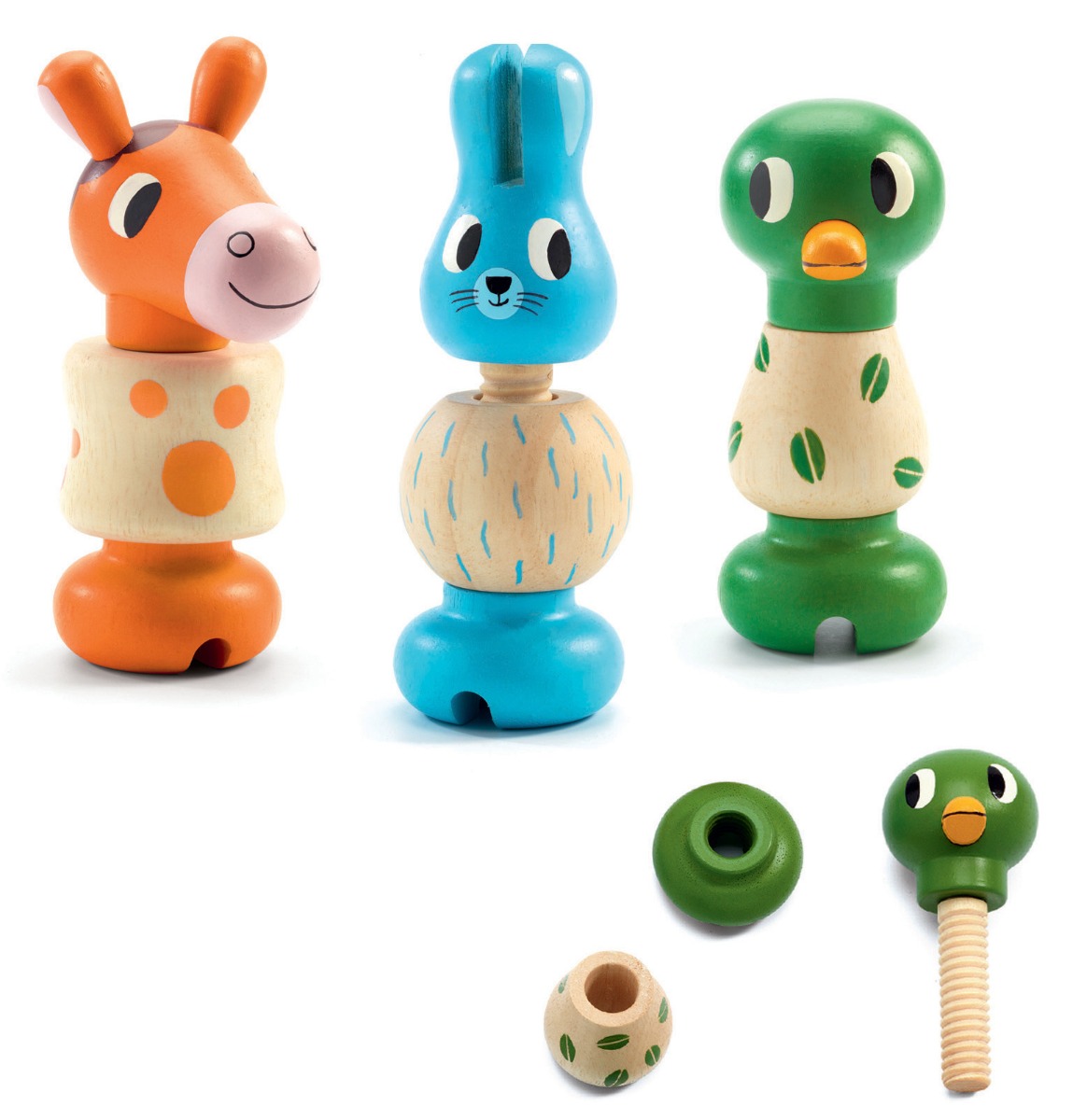 3 søde dyr af træ, som hver består af et hoved, en krop og en bund, som dit barn kan skrue fra hinanden og sætte sammen igen. Den lille skrue-øvelse stimulerer dit barns finmotorik og kontrol over hændernes muskulatur. Æsken måler 16,5x12x6 cm.