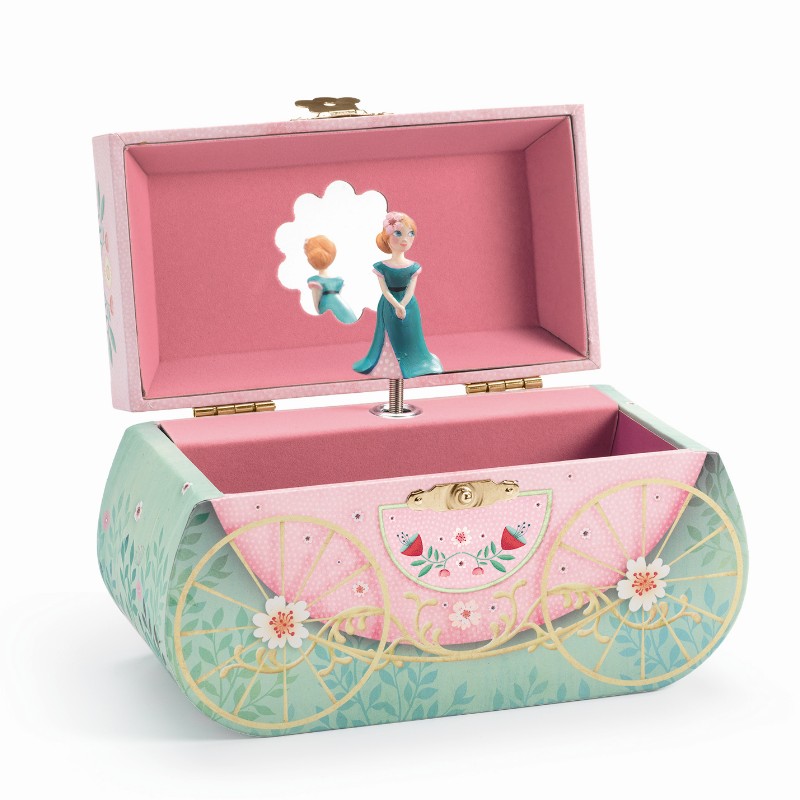 Djeco smykkeskrin spiller musik, og figuren danser piruetter om sig selv, når låget åbnes. Hun trækkes op bag på smykkeskrinet. Det styrker dit barns finmotorik og forståelse for årsag-virkning.Måske havde du selv et smykkeskrin med en danser indeni som barn?Perfekt til hårspænder, skatte, breve og andre fine ting.Når låget er lukket ligner smykkeskrinet en fin karet dekoreret med blomster og fulge og med røde gardiner. Musikken i spilledåsen er sangen Let Me Call you Sweetheart af Leo Friedman. Ikke et nummer, man hører så tit i dag.
