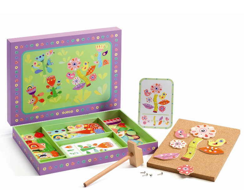 Byg jeres helt egen yndige have med dette lækre sæt fra Djeco. Her er mange skønne havedele i en lækker æske af træ med flere rum, så det er nemt at holde styr på alle dele. I æsken finder I også 40 søm, 5 inspirationskort, hammer og korkplade.Hammer & Søm brættet udvikler dit barns kreativitet.