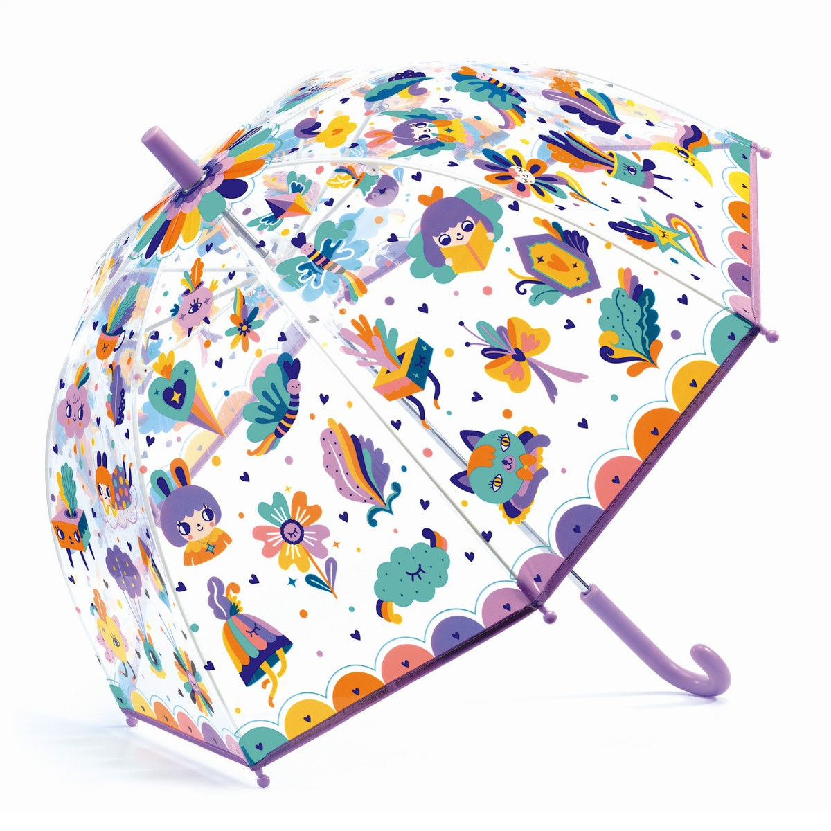 Det er fascinerende for små børn at slå en paraply op og ned igen. Og på denne paraply er åbne-mekanismen smart med et stykke gummi yderst, som beskytter dit barns små fingre, når paraplyen bliver slået op.Den fine Djeco paraply er fydlt med farvestrålende blomster, ansigter, sommerfugle og andre fine figurer, og man kan samtidig kigge ud.Den gennemsigtige baggrund er en god detalje, for så kan dit barn sænke paraplyen men stadig se, om det er ved at gå ind i nogen eller noget.Djecos paraplyer har form som en halvkugle, så dit barn rigtig kan putte sig under paraplyen og blive skærmet for regnen.Paraplyen er let for børnene at slå op og i. Og med plastikdupper på spidserne sker der ikke noget, hvis dit barn får lyst til at danse regndans eller lege linedanser og give paraplyen en snurretur.Producenten anbefaler paraplyen fra 3 år, men sammen med en voksen kan en 2-årig også vandre stolt afsted med sin paraply hjem fra vuggestue.Den måler 70 cm i omkreds og er 68 cm høj. (Begge mål er cirka 10-12 cm mindre end Djecos paraplyer til større børn og voksne)Se også vores andre varianter af flotte paraplyer fra Djeco, som vi både har til børn og til dig. Så kan du finde en lige så fin paraply til dig selv.