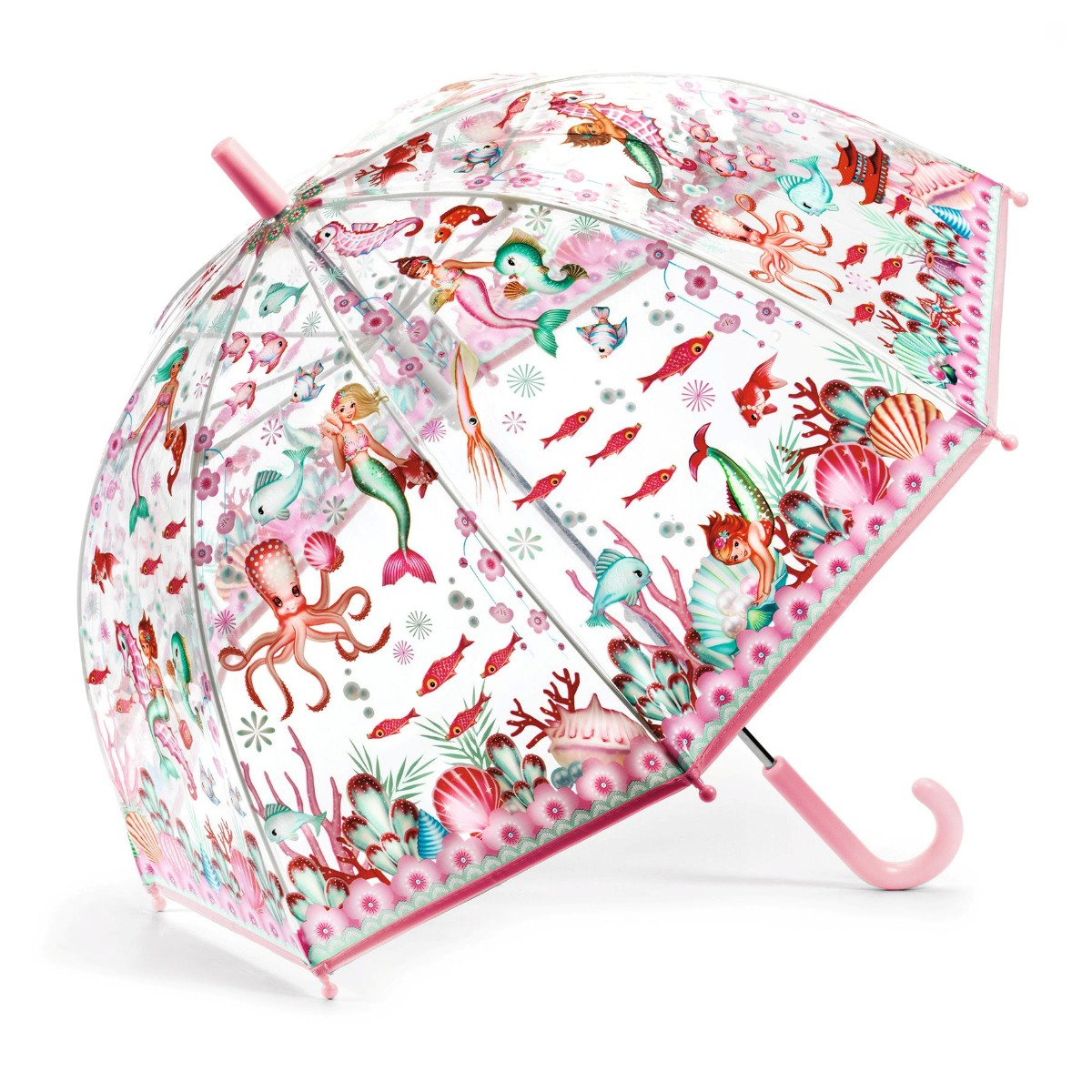 Det er fascinerende for små børn at slå en paraply op og ned igen. Og på denne paraply er åbne-mekanismen smart med et stykke gummi yderst, som beskytter dit barns små fingre, når paraplyen bliver slået op.Med Djecos fine paraplyer kan I gå ud på oplevelse eller hjem fra skole uden at blive både. Den gennemsigtige baggrund er en god detalje, for så kan dit barn sænke paraplyen men stadig se, om det er ved at gå ind i nogen eller noget.Djecos paraplyer har form som en halvkugle, så dit barn rigtig kan putte sig under paraplyen og blive skærmet for regnen.Paraplyen er let for børnene at slå op og i. Og med plastikdupper på spidserne sker der ikke noget, hvis dit barn får lyst til at danse regndans eller lege linedanser og give paraplyen en snurretur.Paraplyen er til børn op til cirka 10 år. Producenten anbefaler paraplyen fra 3 år, men sammen med en voksen kan en 2-årig også vandre stolt afsted med sin paraply hjem fra vuggestue.Den måler 70 cm i omkreds og er 68 cm høj. (Begge mål er cirka 10-12 cm mindre end Djecos paraplyer til større børn og voksne)Se også vores andre varianter af flotte paraplyer fra Djeco, som vi både har til børn og til dig. Du skal da have en lige så fin paraply som dit barn.