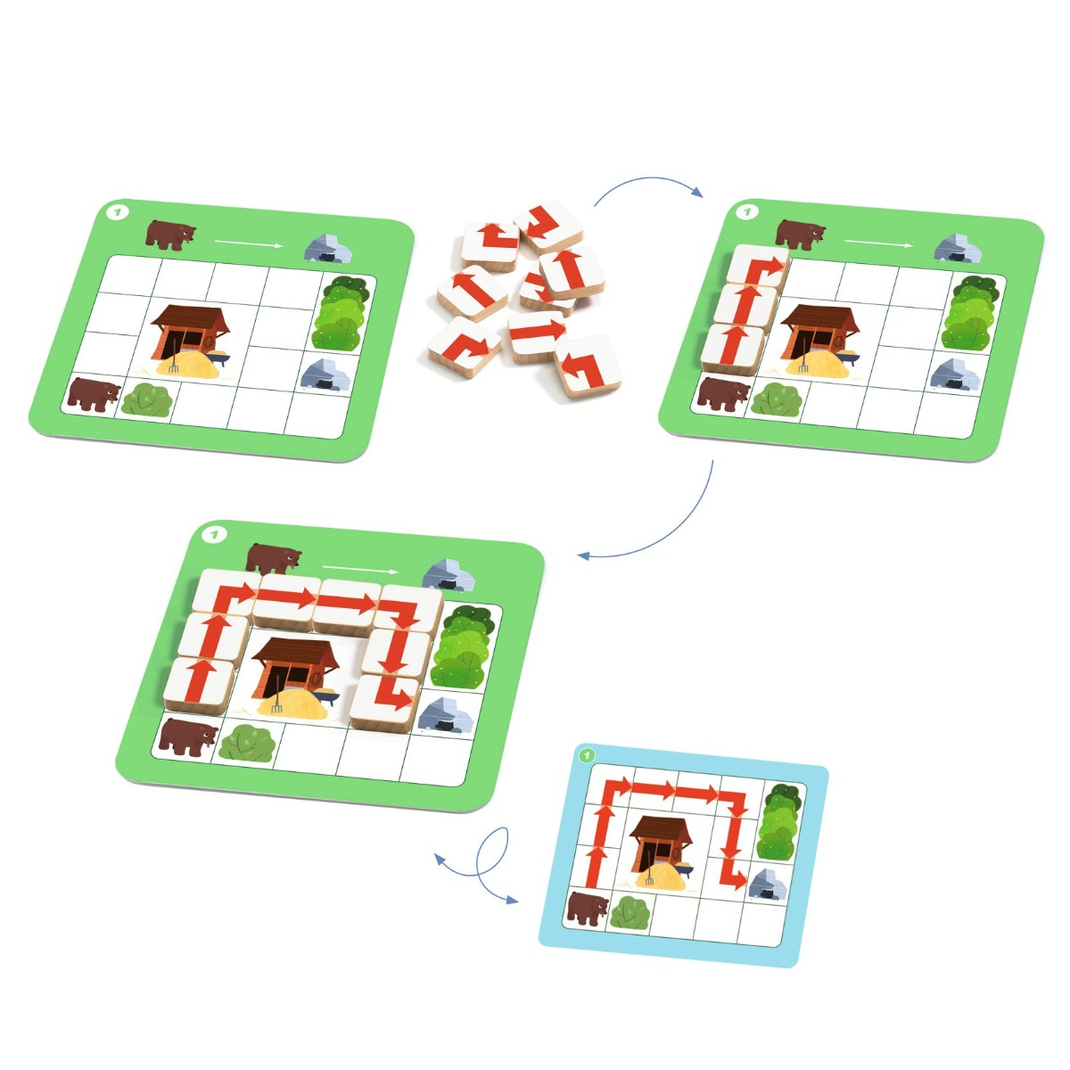 Programmino går ud på at hjælpe dyrene med at finde vej. Der er 24 udfordringer og 15 pilebrikker, som dit barn kan bruge til at løse opgaverne, som er vist med illustrationer, så dit barn ikke behøver at kunne læse.