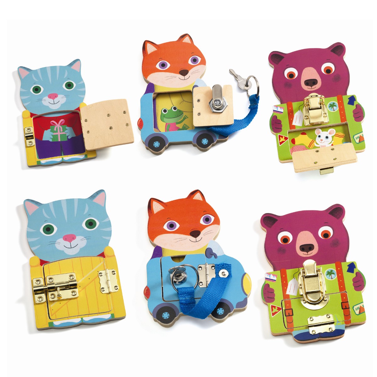 Et kært og udfordrende læringssæt, hvor dit barn skal hjælpe de 3 søde dyr med at blive klar til deres rejse. Kufferterne skal nemlig lukkes, og det skal ske med hver sin form for lukkemekanisme.Legen med de 3 dyr træner dit barns evne til selv at åbne og lukke æsker, kasser, jakker og kufferter - og det giver et fint skub til selvtilliden, når det lykkes.