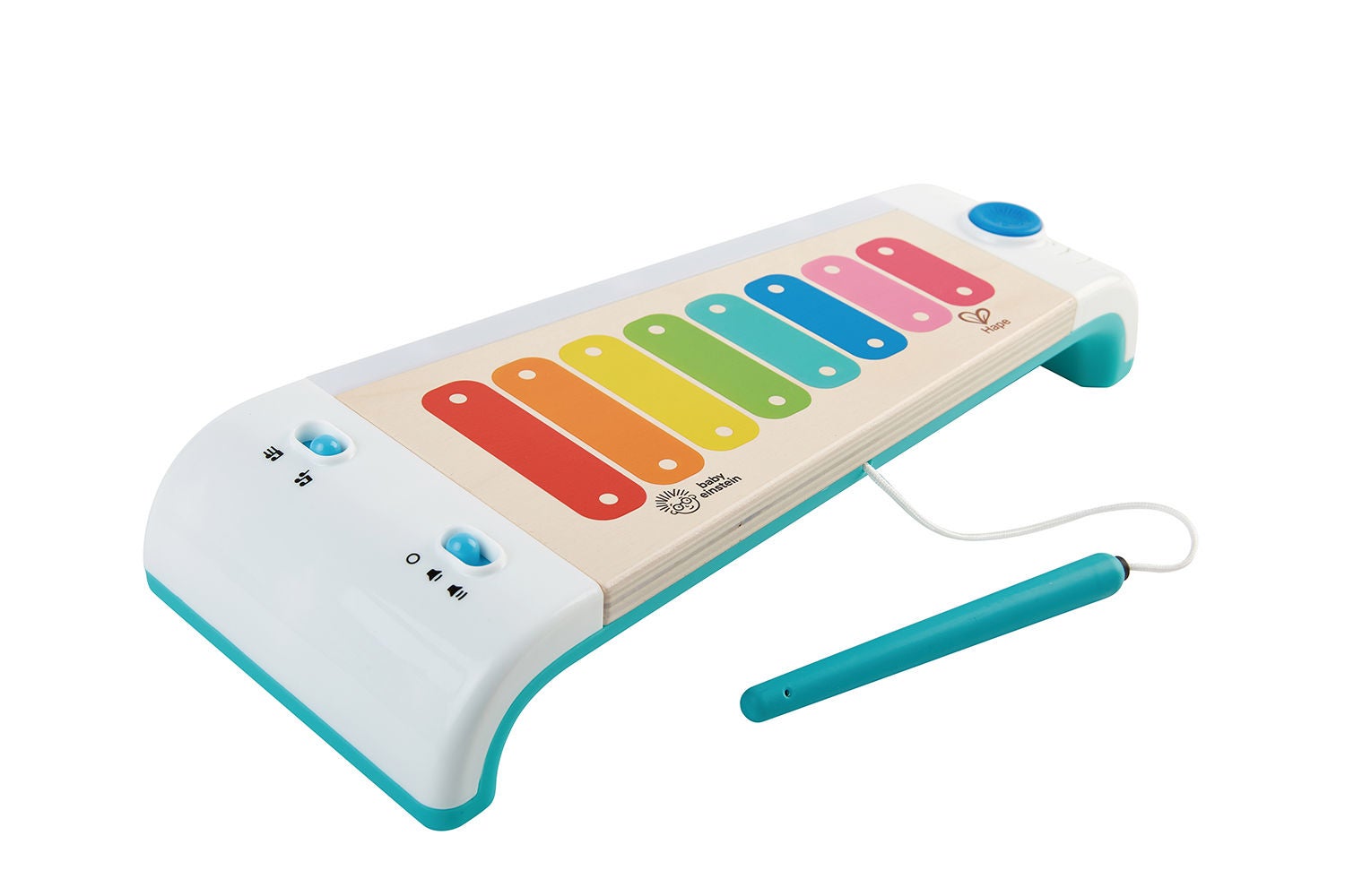 Xylofon fra Hape, fremstillet i træ af høj kvalitet. Ved at slå på tangenterne med den bløde plastikpind, kan dit barn høre rigtige xylofonlyde. Der er mulighed for at vælge mellem to indstillinger freestyle eller indlæring. Instrumentet har flere lysfelter, der tændes, når man slår på tangenterne. Vælg mellem mere end 20 melodier og lyde, der øger kreativiteten og giver små musikere inspiration. Anbefalet alder: Fra 12 måneder.