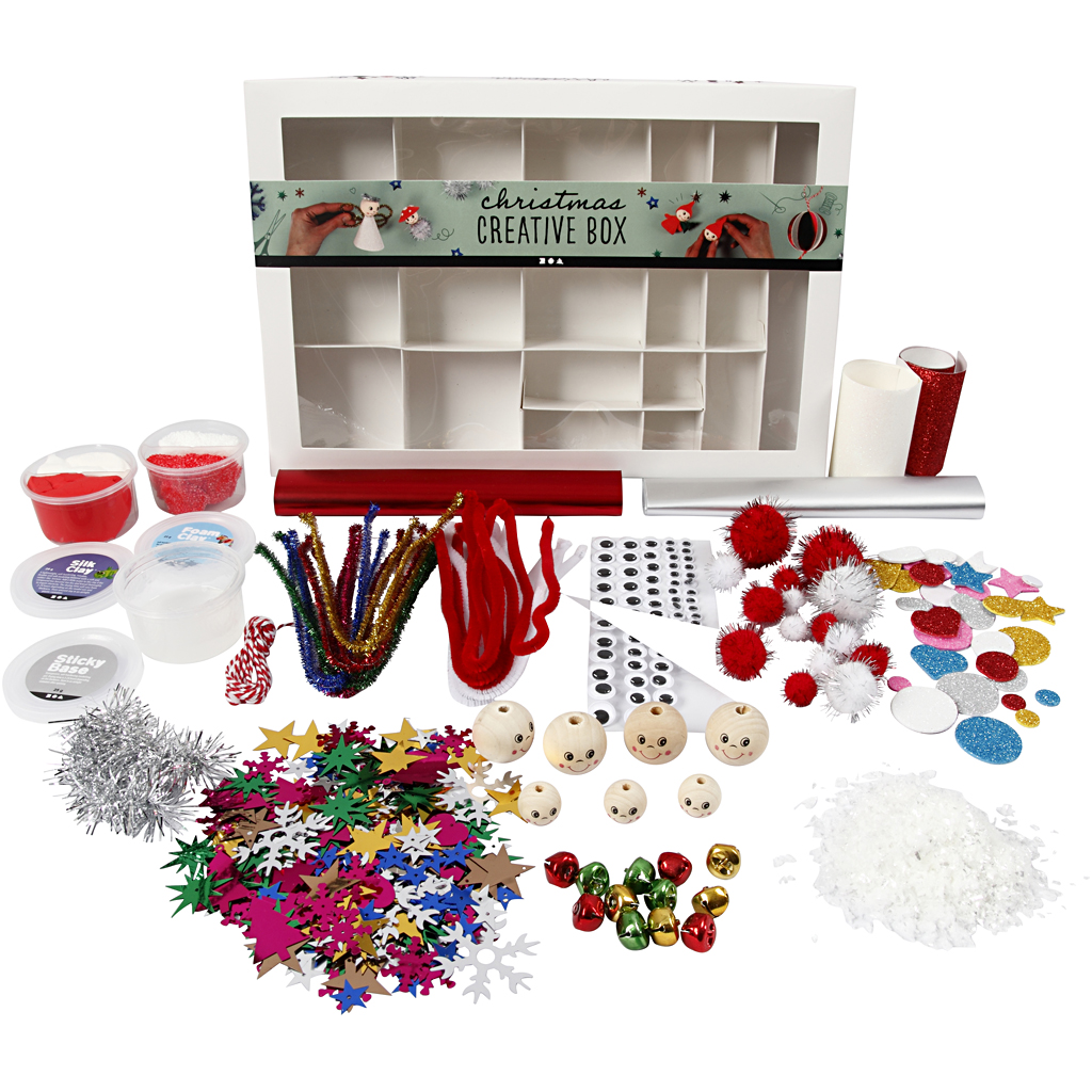 Efter en frisk gåtur i skoven, er det tid til lidt roligere aktiviteter. Tænd for julemusikken, ryd bordet, så der er god plads til kreative udfoldelser, og sæt denne lækre kasse frem med magisk juletema. Så bliver det næsten ikke hyggeligere. Jo, det skulle måske lige være med lidt julegodter til også.Der følger mange samleforeslag med, som ikke kræver større kreative færdigheder. Når noget er færdigt, skal der findes passende pladser, så det kan pynte i jeres hjem.Kassen indeholder: Silk Clay, Foam Clay, Sticky Base, selvklæbende rulleøjne i ass. str., chenille i ass. farve, metal chenille, bjælder i ass. farve, metal papir, snor i bomuld, metal lametta, mosgummi cirkler med glitter, perler med ansigter i ass. str., glitter papir, pomponer i ass. farve og str; kunstig sne og palietter i ass. farve og str. samt samlevejledninger.God som adventsgave.Om Silk Clay og Foam Clay:Silk Clay er en blød, smidig og let masse, der har en lidt skumagtig konsistens. Silk Clay er meget lettere end fx modellervoks, og det er blødt og nemt at forme til fx små figurer til juletræet, vedhæng til smykker, små frugtkurve til dukkehuset og meget mere.Du kan blande flere farver af Silk Clay. Foam Clay føles mere klistret end Silk Clay og er et oplagt valg, hvis I skal dække overfladen af fx flamingofigurer, hjerter eller andre små ting. Så behøver I ikke forme et helt hjerte af Form Clay, men kan nøjes med at overtrække overfladen.Man kan også sagtens lave små figurer af Foam Clay, ligesom man kan med Silk Clay.Hvis det bliver hårdt, kan du ælte en lille smule vand i. Det hærder og bliver hårdt, men stadig let skumagtigt at røre ved, når det lufttørrer i ca 1 døgn.Silk og Foam Clay består af vand, vandopløselige polymer, polystyren og glycerin samt godkendt konserveringsmiddel, og det er lever naturligvis op til REACH-forordningen og er CE-mærket.Dette er en hobbyvare. Vi anbefaler Silk Clay og Foam Clay til børn over 3 år.Små børn kan sagtens være med til kreative aktiviteter, og det har både deres finmotorik, kreativitet og nysgerrighed også stor gavn af. Men det skal ske under voksent opsyn, så børnene ikke sidder alene med denne vare.