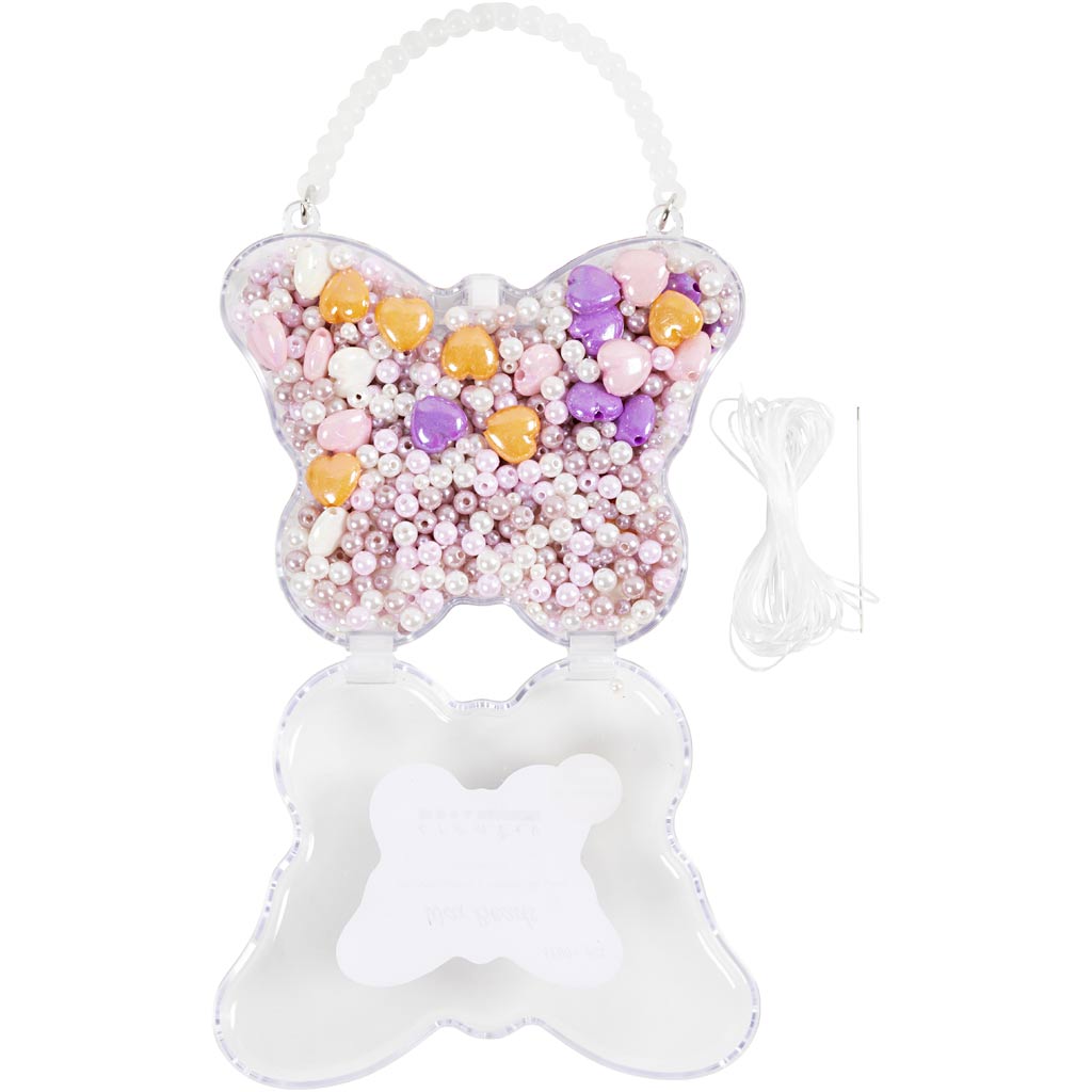 Her er hele 1.800 perler i pastelfarver samlet i en fin sommerfugleęske, som er lige til at gemme, når perlerne en dag er forvandlet til halskęder, armbånd og andre kreationer. Obs: Voksperlerne afgiver en kraftig duft, når du åbner låget de fųrste gange. Vi Legetanter synes, at lugten minder om neglelak. Det er derfor en god ide at åbne ęsken et sted med lidt udluftning (eller ude på altanen eller terrassen, hvis du har sådan én), hvor de kan stå og dampe af. Perlerne lever naturligvis op til de dejligt skrappe krav, som EU har. Men lugten er altså ikke så heldig, så vi anbefaler at den lige hųrmer af, inden du giver perlerne til dit barn.