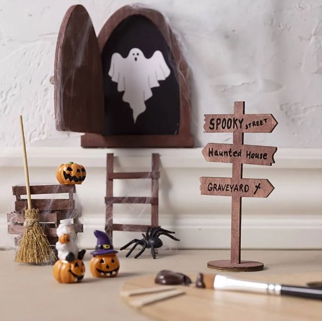 Det gamle spøgelse har længe været misundelig på nissen, som har haft sin egen nissedør i mange hjem. Nu er det spøgelsets tur til også at få et hjørne, det kan kalde hjem. Måske giver det slik som tak - eller skrivet bøh i en rest mel nær døren. Sættet indeholder vejledning og alt, I behøver for at skabe et dejligt hjem for spøgelset: Dør, figur, skilt, kost, lidt skønt spindelvæv, edderkopper til selskab, ispinde, maling, lim, pensel og print.