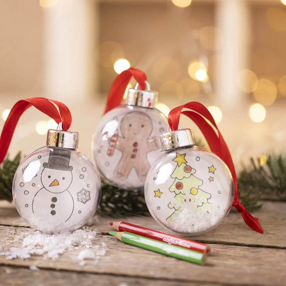 Lad dit barn selv tegne de fine tegninger og lægge dem i plastkuglerne. Dekorer med glimmerlimen, så det bliver ekstra fint. Kuglerne vil være meget fine på træet i år, og de kommende år kan I smile ad dem og huske tilbage, til da kunstneren var lille.Indhold: Julekugler, kartoncirkel m. motiv, farveblyant, bånd, sne og lim.