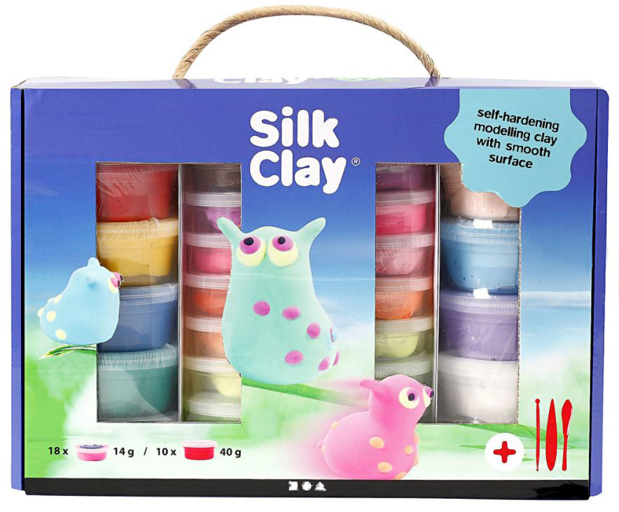 Elsker I at være kreative sammen derhjemme? Så er denne store gaveæske det helt rigtige. Her er hele 28 dåser med forskellige farver af det silkebløde Silk Clay, der kan bruges ligesom gammeldags modellervoks, men som er meget lettere, blødere og smidigere. Og så lufttørrer det på et døgns tid og bliver helt hårdt. Super lækkert materiale til både børn og voksne. Indhold: 10 ds. à 40 g, 18 ds. à 14 g og 3 ass. modelleringsværktøj. Leveres i gaveæske (32,5x23x8,5 cm)Silk Clay:En blød, smidig og let masse, der har en lidt skumagtig konsistens. Silk Clay er meget lettere end fx modellervoks, og det er blødt og nemt at forme til fx små figurer til juletræet, vedhæng til smykker, små frugtkurve til dukkehuset og meget mere.Du kan blande flere farver af Silk Clay.Hvis det bliver hårdt, kan du ælte en lille smule vand i.Det hærder og bliver hårdt, men er stadig let skumagtigt at røre ved, når det lufttørrer i ca. 1 døgn.Silk Clay består af vand, vandopløselige polymer og glycerin samt godkendt konserveringsmiddel, og det er lever naturligvis op til REACH-forordningen og er CE-mærket.Dette er en hobbyvare.Vi anbefaler Silk Clay til børn over 3 år.Denne vare er uegnet til børn under 3 år. Små børn kan sagtens være med til kreative aktiviteter, og det har både deres finmotorik, kreativitet og nysgerrighed også stor gavn af. Men det skal ske under voksent opsyn, så børnene ikke sidder alene med denne vare.Her kan du finde inspiration til leg med clay.
