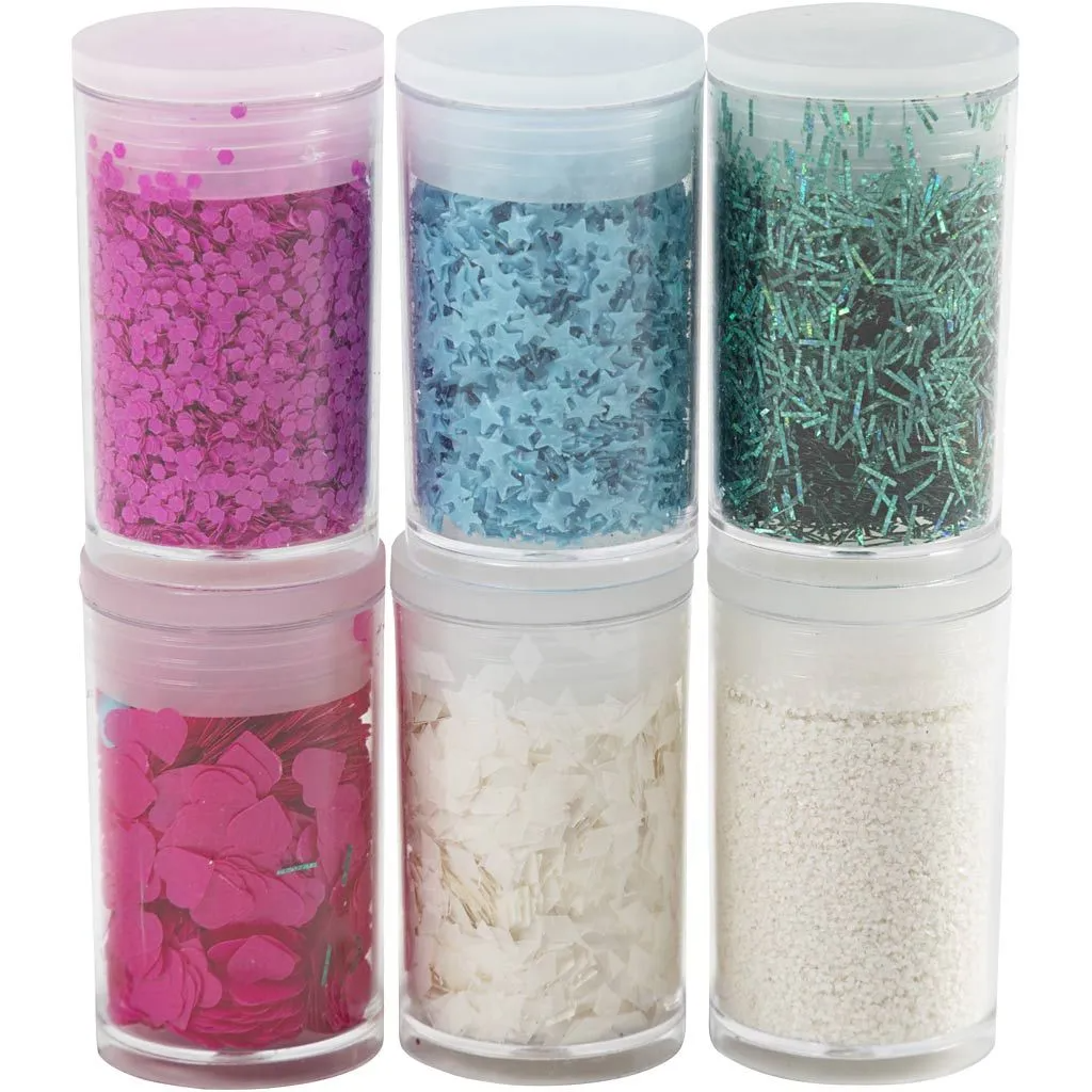 Glimmer er som at drysse stjernestøv ud over det hele. Her er der 6 farver som du og dit barn kan bruge til flotte og glitrende effekter på jeres kreative projekter.Drys det på våd maling eller lim på eksempelvis træ, pap, karton, papir, kastanjedyr, rullinger, fødselsdagsinvitationer, navneskilte og julekort.Hvis du blander glimmeret og pailetterne i vandholdige eller andre flydende ting eller lader det ligge på meget våde materialer som fx håndlavet papir der tørrer langsomt, kan glimmeret gå lidt i opløsning, så farven smitter af.Glimmeret og pailetterne er bionedbrydelige - det skal glimmer være for at leve op til EU's miljølovgivning om mikroplast.Skulle det ved et uheld komme i naturen eller i dit afløb bliver det nedbrudt over tid, så det ikke ender som mikroplast.