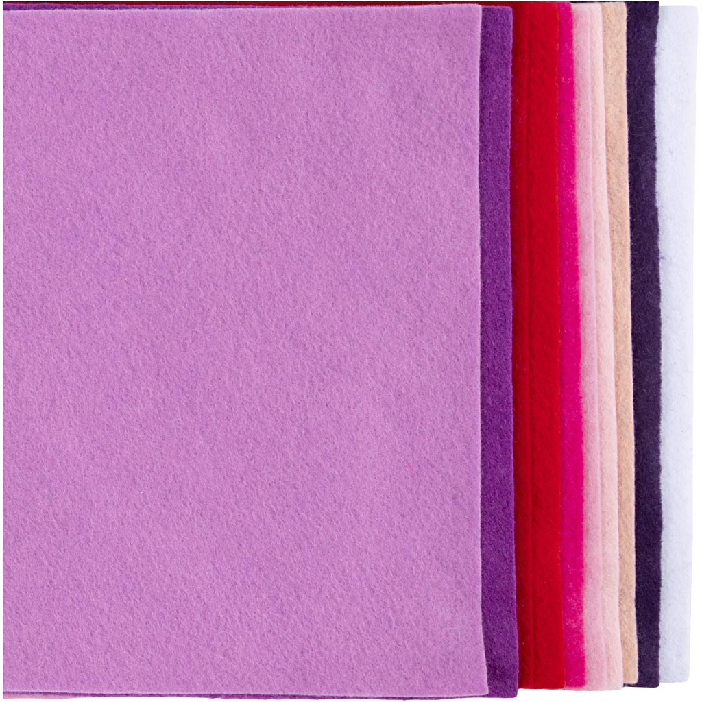 Pakke med 10 ark blød filt i primært lilla og lyserøde farver. Af 100 % polyester.Velegnet til både bamser, nissens hue, dukkens trøje, syprojekter, påskepynt, juleophæng og projekter med at klippe og klistre for små og store. Kanterne trevler ikke når dit barn klipper i filten. 2 mm tykke ark.