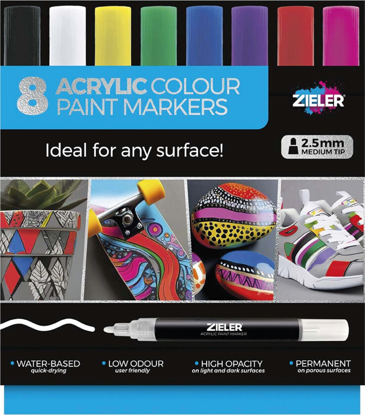 Slip kreativiteten løs med Zieler akryl paint markers et sæt med 8 markører i klare, primære...