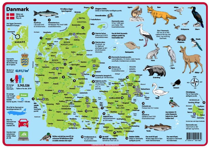 De lærelystne børn vil elske at kunne gå på opdagelse i det ganske, danske land med denne flotte dækkeserviet. Brug kvalitetstiden under aftensmåltidet på at skabe samtale omkring geografi, dyreliv m.m., som kan være lærerigt for både børn og voksne. Størrelse: A3.Aftørres nemt med en fugtig klud.