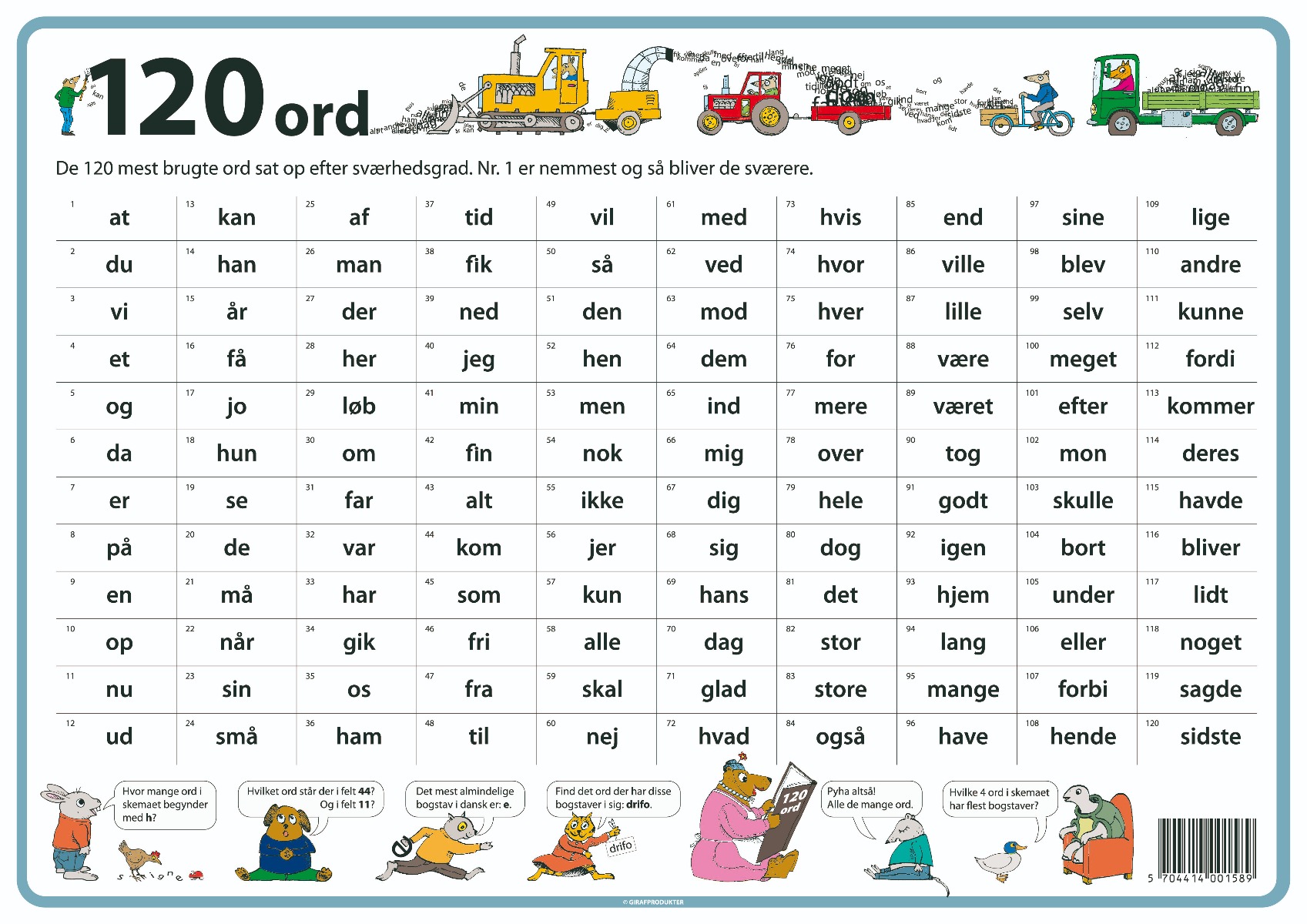Der findes massevis af ord i vores sprog, men særligt 120 af dem bruger vi ret så hyppigt. Derfor er det godt at få dem automatiseret tidligt, da de ikke alle er helt lydrette og nemme at læse.Når man er begynderlæser, kan man nemlig ikke læse sig til at, når der står hvem, så bliver det væm eller at de læses som di. Det er man nødt til at lære.I kan øve dem derhjemme, mens I spiser med en sej dækkeserviet, hvor alle de 120 ord står på. Jo mere I øver, desto hurtigere og bedre lagrer det sig i dit barns hukommelse, og deres forudsætninger for at læse øges.Dækkeservietten har mål som A3.Den kan også anvendes som skriveunderlag.