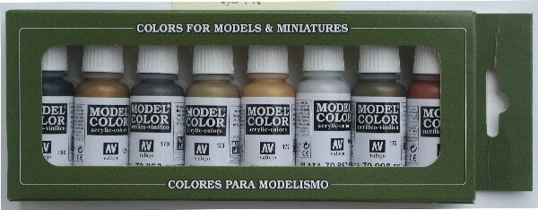 Metallic malingsæt med 8 Model Color-referencer til maling af modeller, figurer og dioramaer. Indeholder flasker med 17 ml (med pipette) og et farvekort. Indhold (farver): - 70.800 Gunmetal Blue -...
