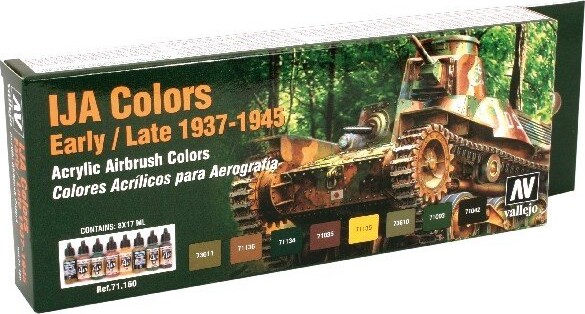 IJA Colors Early / Late 1937-1945 malingsæt indeholder farverne til at male den kejserlige japanske hærs (IJA) camouflagefarver og omfatter mønsteret til HA-Go tidlige camouflagefarver i Kina og...