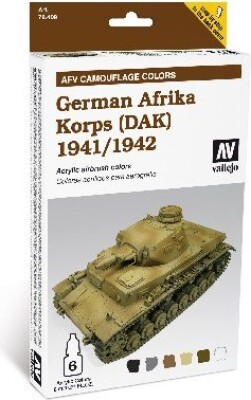 German Afrika Korps 194142 malingsæt indeholder farverne til de tidlige DAK-køretøjer fra Afrikakorpset. Matte akrylfarver, vandbaserede og specielt udviklet til airbrushing. Model Air...