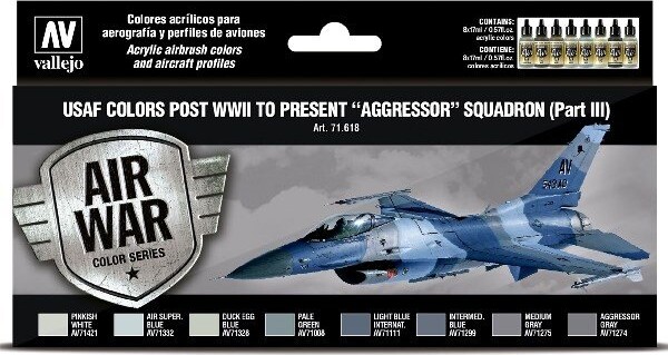 USAF Colors Post WWII Aggressor Part III malingsæt med Model Air farver udviklet til at male de overvejende blå camouflagemønstre fra USAF's "Aggressor" eskadriller. Sættet...