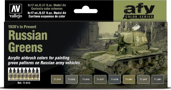 Russian Greens (1928's To Present) malingsæt indeholder alle de grønne nuancer, der bruges til grundfarver og camouflagemønstre på kampvogne samt lette og tunge køretøjer. Fra begyndelsen i...