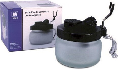 Rengør din airbrush med denne rensebeholder. Rensebeholderen er lavet i glas med et plastiklåg og bruges til at spray-rengøre din airbrush. Airbrushen sættes ned i åbningen i plastiklåget og...