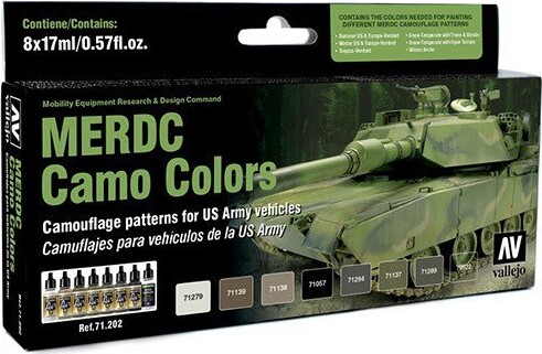 I 1970 udviklede US Mobility Equipment Research & Design Command (MERDC) et system med camouflagemønstre til amerikanske hærs køretøjer. Her får du farverne til at male netop disse farver....