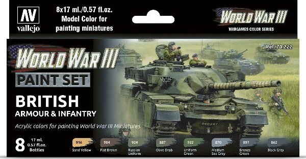 WWIII British Armour & Infantry malingssæt sammen med Utility Paint sættet indeholder alle de farver, der er nødvendige for at male den britiske hær, infanteri og fly. Indhold (farver): -...