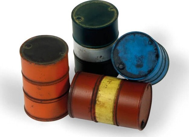 Fire moderne brændstoftønder med skruelåg på toppen. Brændstoftønder blev anvendt til civil og generel opbevaring af benzin og andre brændstoffer som f.eks. tunge olier. Specifikationer: -...
